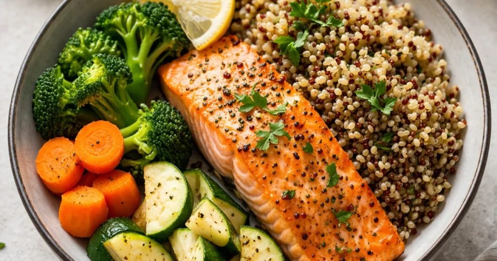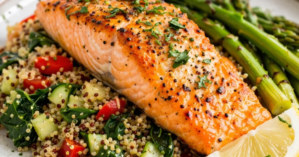 - Quinoa (½ cup cooked) — 110 cal; complete protein, complements the salmon’s amino acids