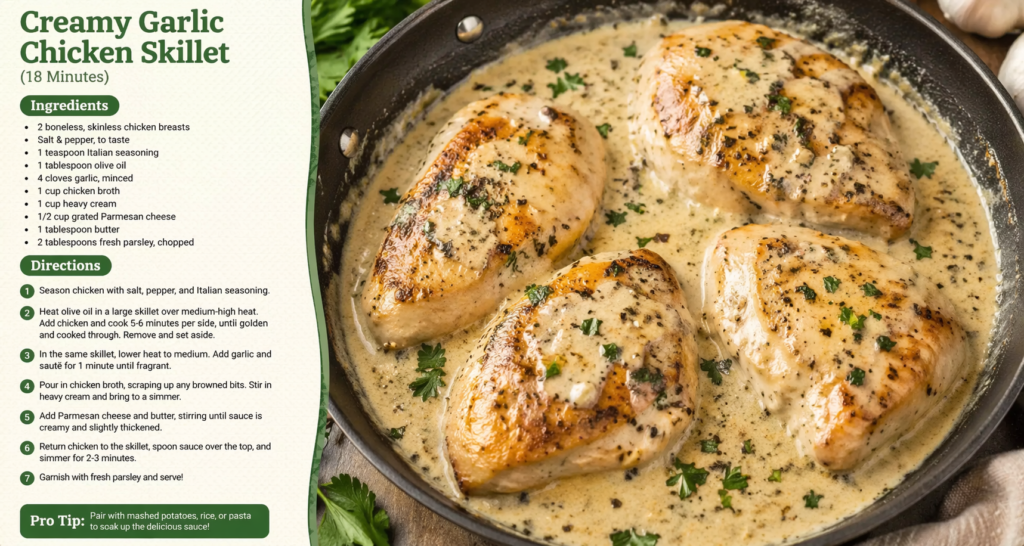 Recipe 4: Creamy Garlic Chicken Skillet (18 Minutes)